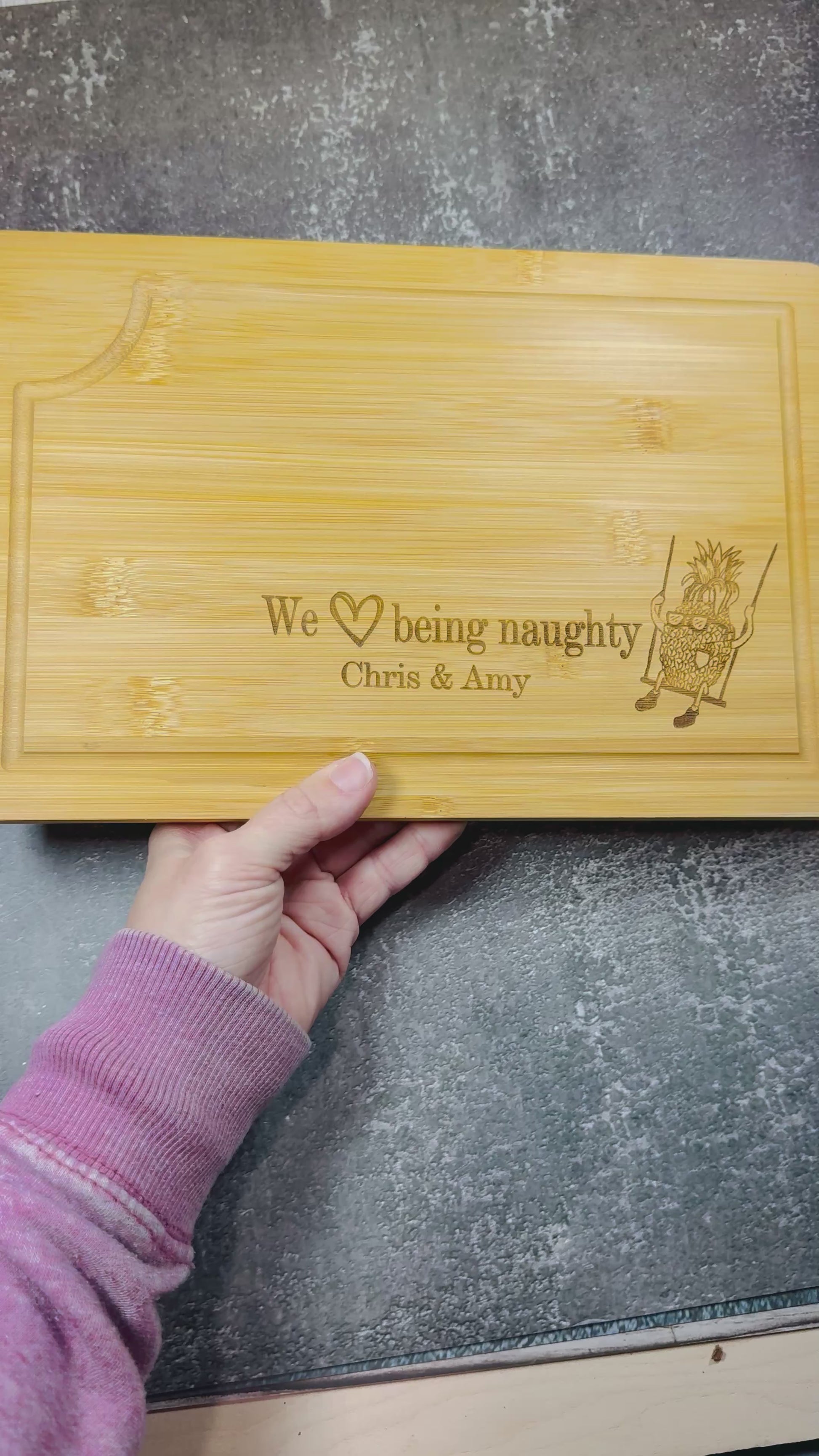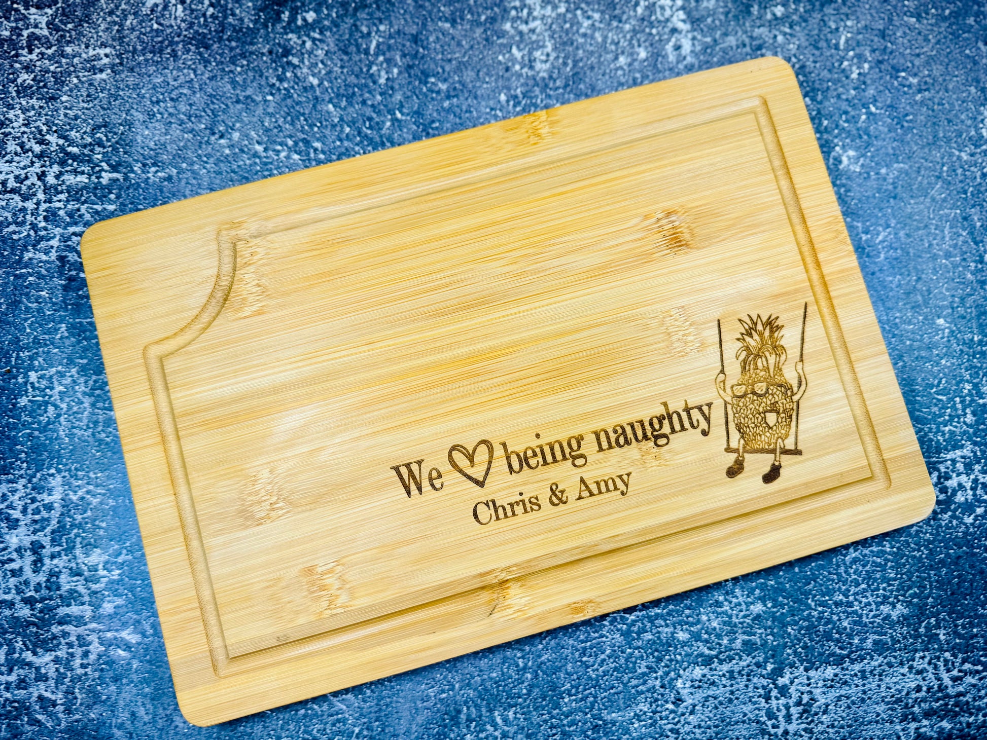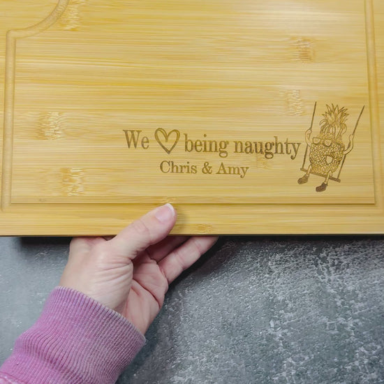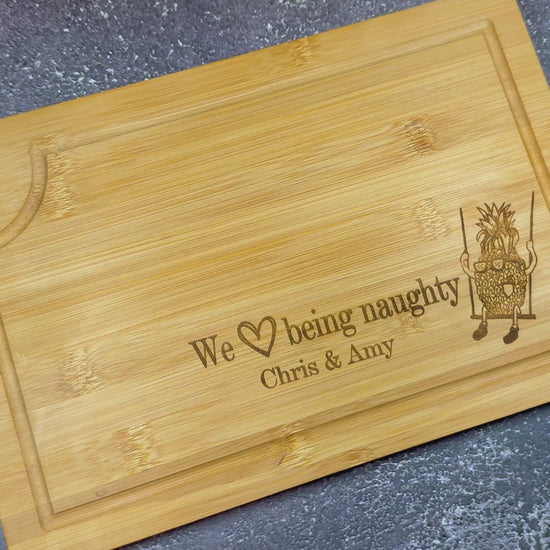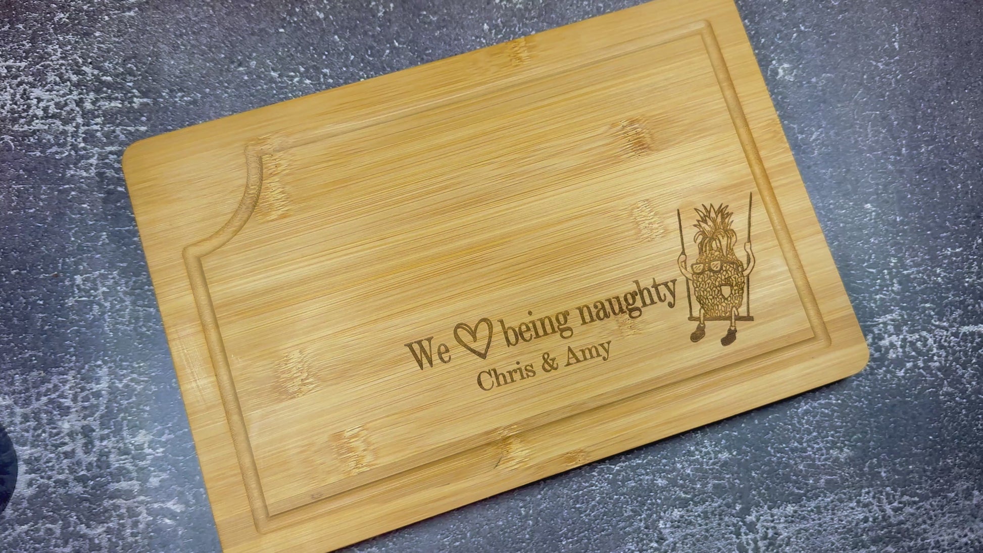 Text, such as family names, company names and sports teams, along with any artwork needed are added using Pyrography, aka wood-burning. Pyrography is laser engraved so the words will not rub off. You are able to chop on the same side of the design.